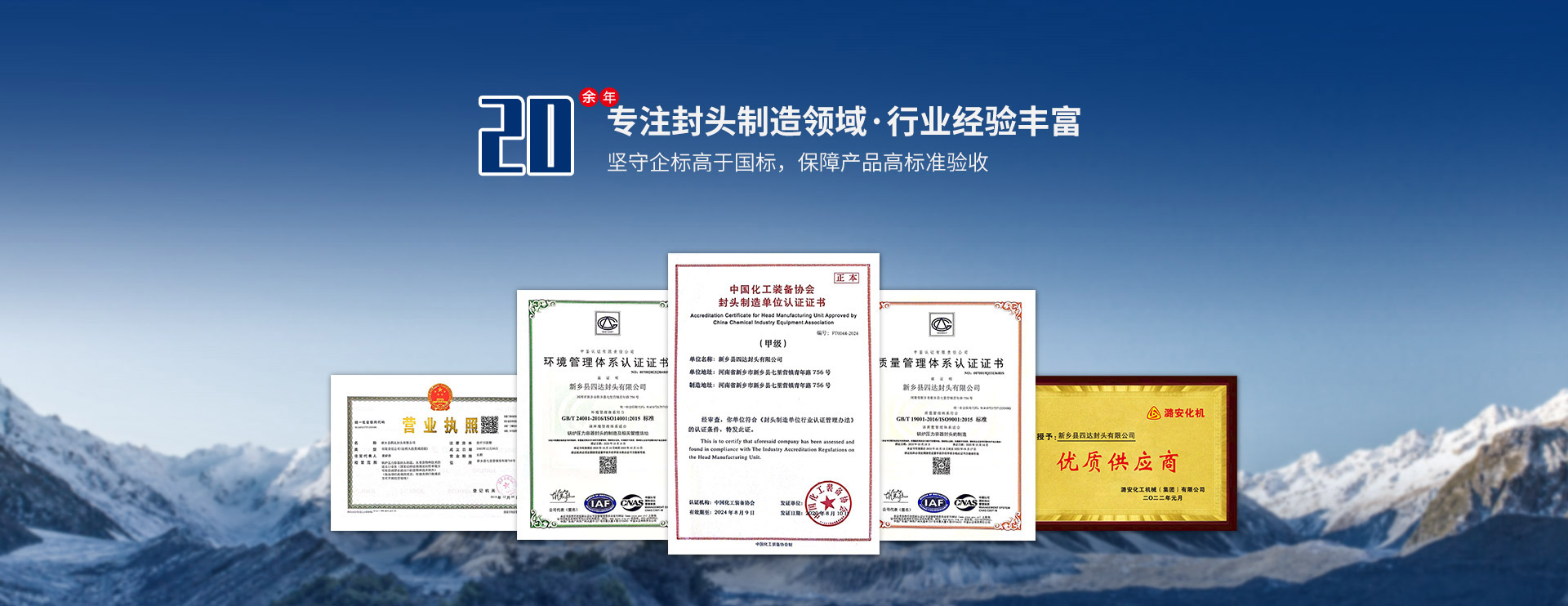 遵循國家標準、美國ASME標準生產(chǎn),取得A3級鍋爐壓力容器部件生產(chǎn)許可,中國化工裝備協(xié)會封頭甲級認證,為產(chǎn)品提供資質(zhì)保障;